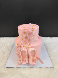 Grace meets celebration in this ballet-themed birthday cake, featuring two tiers of soft pink icing, delicate flowers with yellow centers, and elegant gold detailing. A pair of pink ballet shoes with ribbons sits at the base, while the name “Kridm” adds a personalized touch. Perfect for dancers, ballerinas, or anyone who loves graceful design.