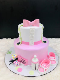 Celebrate Anaya’s special day with this beautifully crafted two-tier baby birthday cake featuring a soft pink and white palette. The top tier is adorned with a large pink bow and white buttons, while the base showcases fondant baby-themed decorations including a bottle, pink shoes, alphabet blocks, and green circular accents. A white plaque reads “Happy Birthday Anaya,” anchoring the tribute with clarity and warmth. Presented on a white circular board against a fur-textured surface, this cake blends childhood charm with sculpted finesse—perfect for birthday gifting, baby uploads, or catalog entries that highlight innocence, celebration, and visual storytelling.