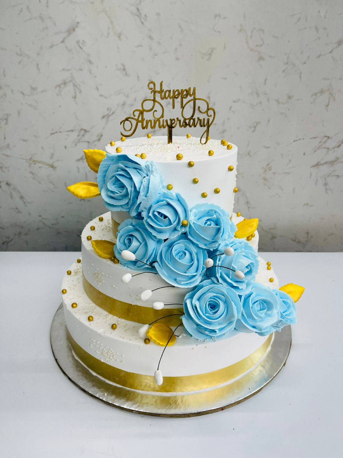 The image features an exquisitely decorated two-tiered cake, designed specifically for an anniversary celebration. This cake stands out with its elegance and sophistication, making it a perfect centerpiece for such a special occasion. The harmonious combination of white, gold, and blue elements creates a visually appealing design that exudes luxury and refinement.
