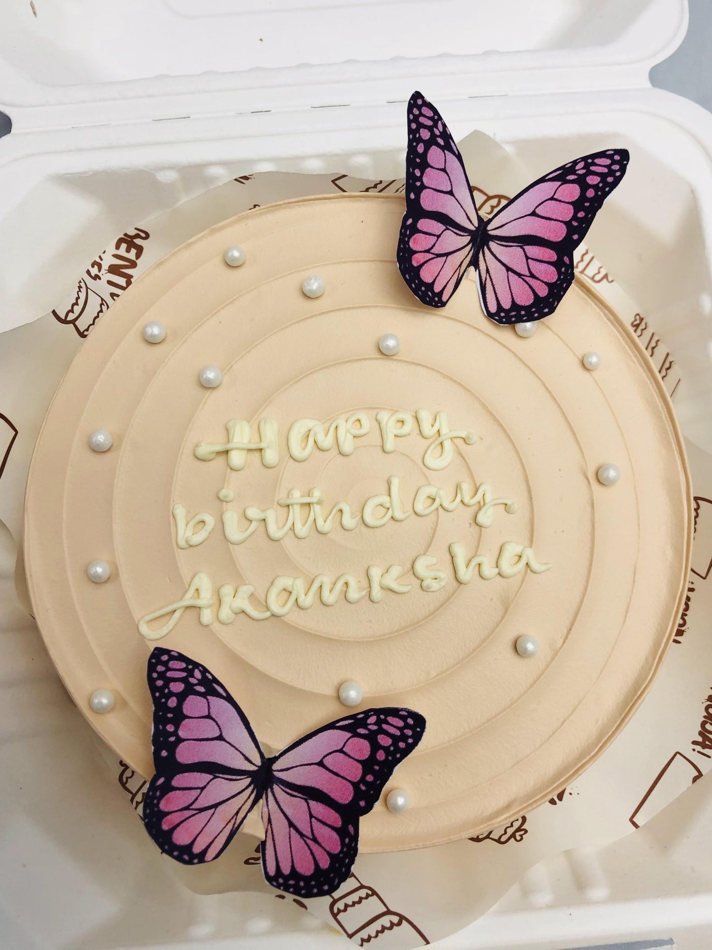 The cake features a smooth, creamy beige frosting that serves as a canvas for the intricate decorations. The highlight of the cake is the personalized message "Happy birthday Akanksha" written in elegant white icing, making it a thoughtful and unique gift for the special person in your life.