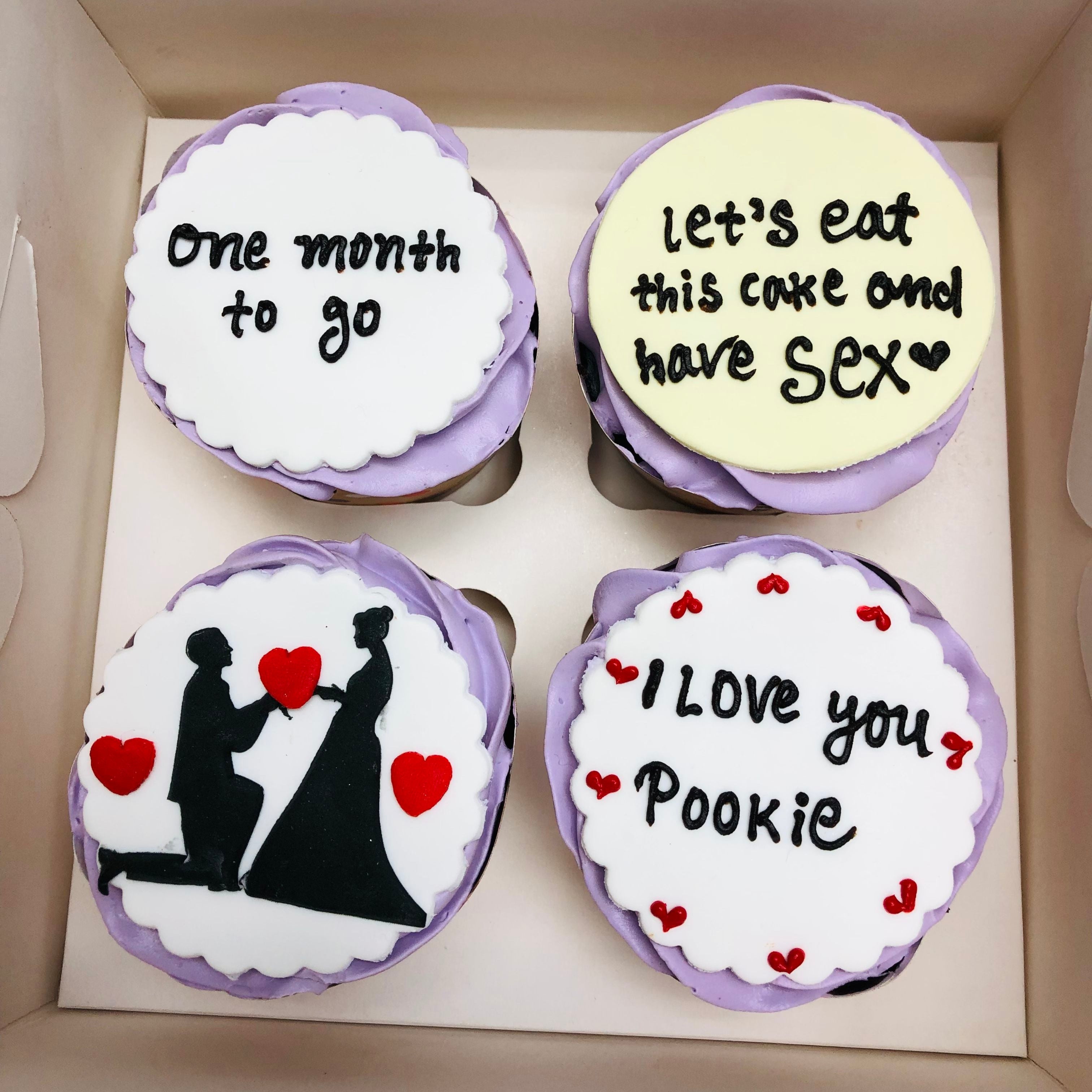 Cupcake 2: Features a white fondant top with the playful message "let's eat this cake and have SEX" in black icing, accompanied by a small heart.