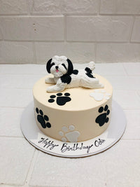 Celebrate your furry friend with Odin’s custom dog-themed birthday cake. Featuring a lifelike black and white fondant dog topper, paw print accents, and the message “Happy Birthday Odin” in elegant script, this cake is perfect for pet lovers or birthday tributes to beloved dogs. The clean white base and monochrome styling add sophistication to this heartfelt design.