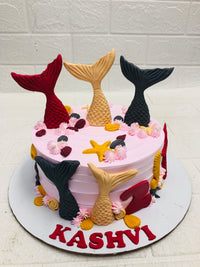 Celebrate Kashvi’s 3rd birthday with this mermaid-themed cake featuring a light pink frosting base and six fondant mermaid tails in red, beige, black, and dark blue. The top is adorned with seashells, starfish, and pastel flowers, creating a whimsical undersea vibe. The base includes the name “KASHVI” and a red number “3” in bold fondant, making this cake perfect for ocean-loving kids, fantasy parties, or gifting drops with magical flair.
