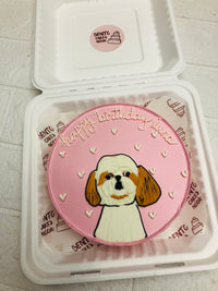 Celebrate Luna’s special day with this pastel-perfect bento-style cake featuring a smooth pink frosting base and a detailed illustration of a Shih Tzu with white and brown fur. The dog’s gentle expression is surrounded by small white heart decorations, amplifying the affection-forward theme. The message “happy birthday luna” is piped in elegant cursive across the top, anchoring the tribute with warmth and personality. Presented inside a white takeout-style container lined with branded “DENTC CAKES KOREA” parchment, this cake blends pet-forward styling with sculpted finesse—perfect for dog gifting, pet uploads, or catalog entries that highlight love, cuteness, and emotional resonance.