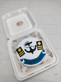 Celebrate with maritime flair using this navy-themed cake featuring a black anchor wrapped in white rope, a yellow star, and two naval insignias. The blue ribbon piping reads “Happy Birthday AC,” and the cake is presented in a white takeout-style box lined with “2unic” branded paper and a “Sweet Cake” sticker. Perfect for birthdays of navy personnel, maritime enthusiasts, or rank-themed gifting.