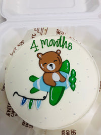 Celebrate a joyful 4-month milestone with this playful bento cake featuring a smooth white frosting base and a fondant illustration of a brown teddy bear riding a green and blue airplane. The message “4 Months” is piped in green icing above the figure, adding a touch of celebratory charm. Presented in a white takeout-style container with branded liner, this cake blends baby sweetness with whimsical finesse—perfect for monthly milestone gifting, tribute drops, or uploads that highlight growth, love, and gentle celebration.