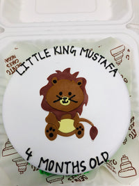 Celebrate four months of baby joy with this heartwarming bento cake featuring a smooth white frosting base and a fondant lion topper—crafted in brown and yellow tones with a smiling face, tufted tail, and upright pose. The message “Little King Mustafa” is piped in black icing above the lion, with “4 Months Old” written below, blending playful royalty with milestone sweetness. Presented in a white takeout-style container with branded liner, this cake is perfect for baby gifting, monthly tribute drops, or uploads that highlight love, growth, and celebration.