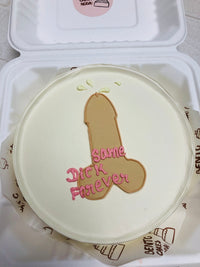 Celebrate love with a wink using this humorous bento-style cake featuring a white frosting base and a bold illustration made with pink and brown icing. The message “Same Dick Forever” is written across the center in playful pink script, making this cake perfect for romantic gifting, cheeky couple drops, or mood-forward uploads with unapologetic flair. Presented in a white takeout-style container with branded parchment lining.