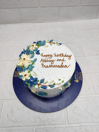 Celebrate a special bond with our “Bloom for Two” cake — a soft white canvas adorned with delicate blue, green, and white florals, piped with love and precision. The heartfelt message in rich brown icing makes it perfect for birthdays shared between siblings, best friends, or couples. This cake brings warmth, elegance, and a personal touch to any celebration.