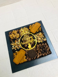 Celebrate love with this square-shaped anniversary cake, topped with Lotus Biscoff biscuits, Oreo cookie, chopped walnuts and pistachios, chocolate drizzle, and chocolate-covered coffee beans. A golden “Happy Anniversary” topper featuring a romantic couple silhouette adds elegance and charm. Perfect for couples who love rich flavors and bold textures. Presented on a sleek black board for a premium look.