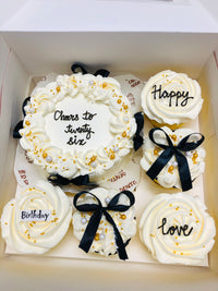 Celebrate turning twenty-six with this sophisticated cake and cupcake set. The central cake features white frosting, gold sprinkles, and black ribbon bows, topped with the message “Cheers to twenty six” in black icing. Surrounding it are four matching cupcakes, each with white frosting, gold accents, and black bows. Cupcake messages include “Happy,” “Birthday,” “love,” and a minimalist design. A refined and personal set for marking a stylish milestone.