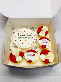 Celebrate six months of love with this romantic bento cake set featuring a white round cake piped with the message “6 months down forever to go!” in black icing, scattered with red heart accents. The set includes six decorated cupcakes with red and white frosting, edible pearls, and personalized toppers: