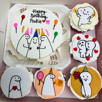 The centerpiece of this set is a beautifully decorated round cake with a heartfelt "Happy Birthday Pookie" message. The cake features three charming cartoon characters wearing colorful party hats, surrounded by festive balloons and streamers. The simple yet endearing design makes it a perfect choice for both children and adults.