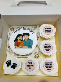Celebrate love, companionship, and gratitude with this personalized birthday cake set. The main cake features an illustration of a couple holding a cat, with “HAPPY BIRTHDAY” written above. Surrounding it are five themed cupcakes, each with heartfelt messages like “I’LL BE THERE FOR U!” and “THANKS FOR THE TIME THE MOST PRECIOUS MOMENT IN THE WORLD.” One cupcake features black paw prints, adding a sweet nod to pet love. A perfect gift for couples who cherish shared memories and furry friends.