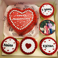 Please Note: Dark Color Icing On Cakes Sticks on Hands, Leave Stains and might be bitter in Taste. Celebrate two years of love and togetherness with this Heart Shape Anniversary Bento Combo Cake. Designed to reflect romance and thoughtfulness, this set is a perfect choice for making your special day unforgettable.