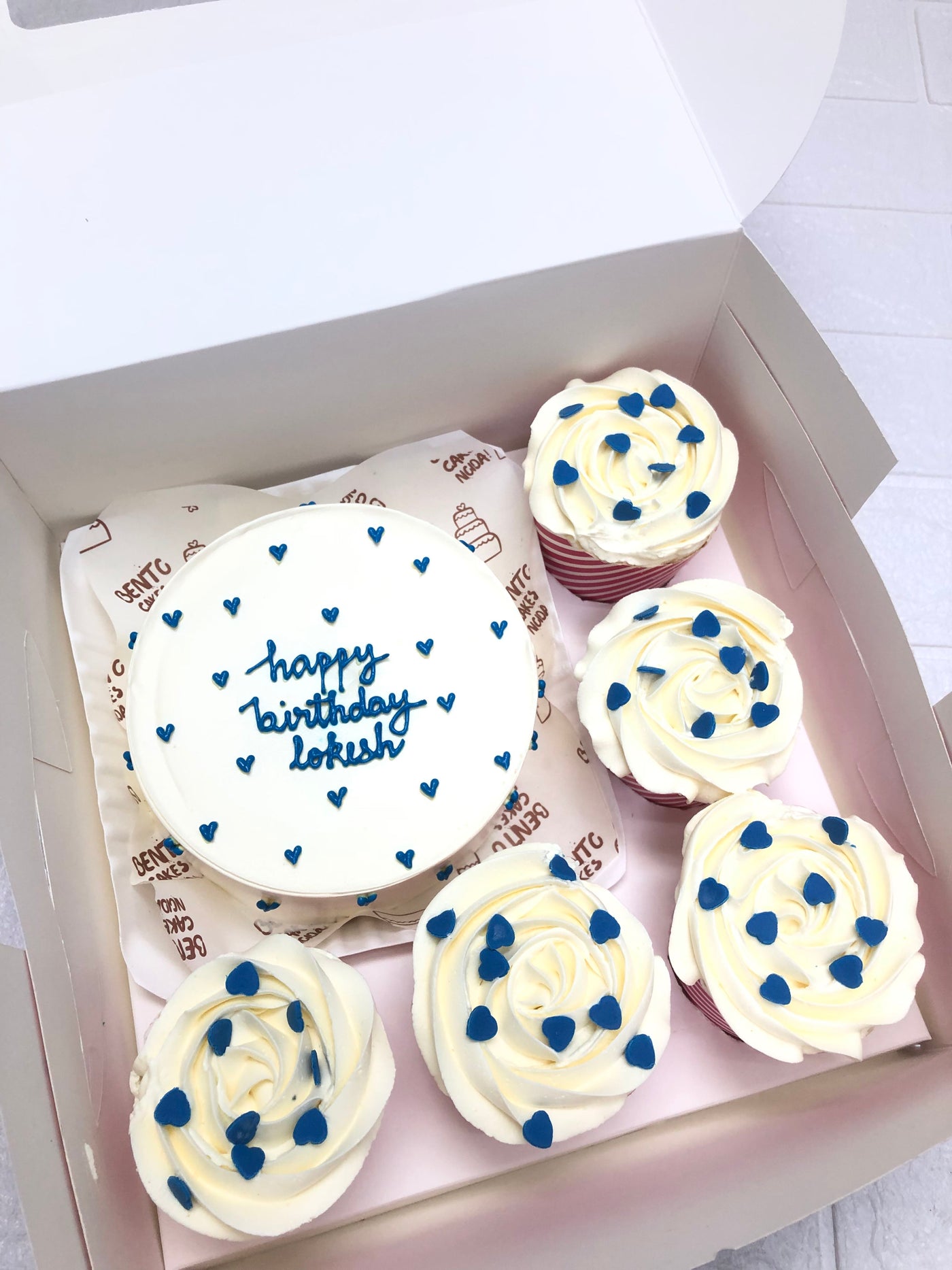 Celebrate Lekesh’s birthday with this elegant cake and cupcake set featuring white frosting and blue heart accents. The central cake carries the message “happy birthday lekesh” in soft blue icing, surrounded by six matching cupcakes with swirled frosting and heart sprinkles. Presented in red-striped liners and a decorative box, this set is perfect for heartfelt gifting, minimalist celebrations, or personalized birthday surprises.