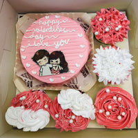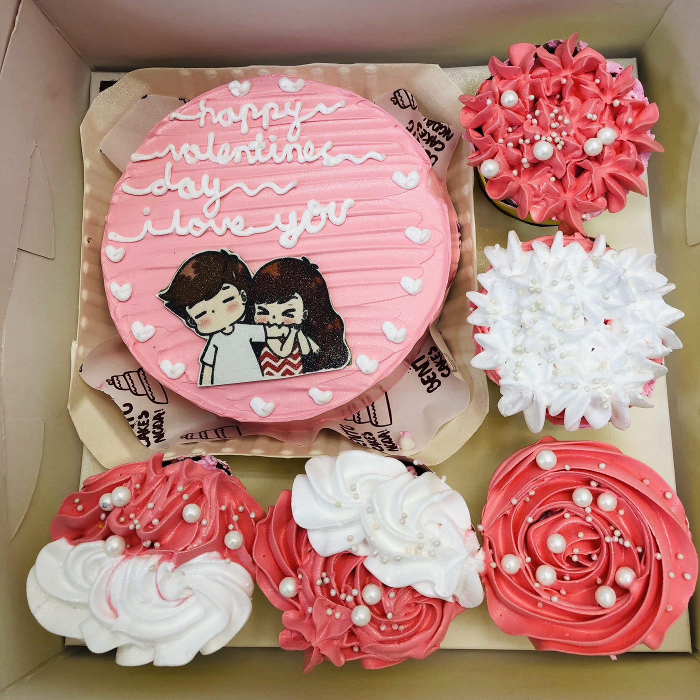 Celebrate love with this delightful White-Pink Valentine's Day Bento Combo Cake set. Featuring a beautifully crafted round centerpiece cake and six matching cupcakes, this s...