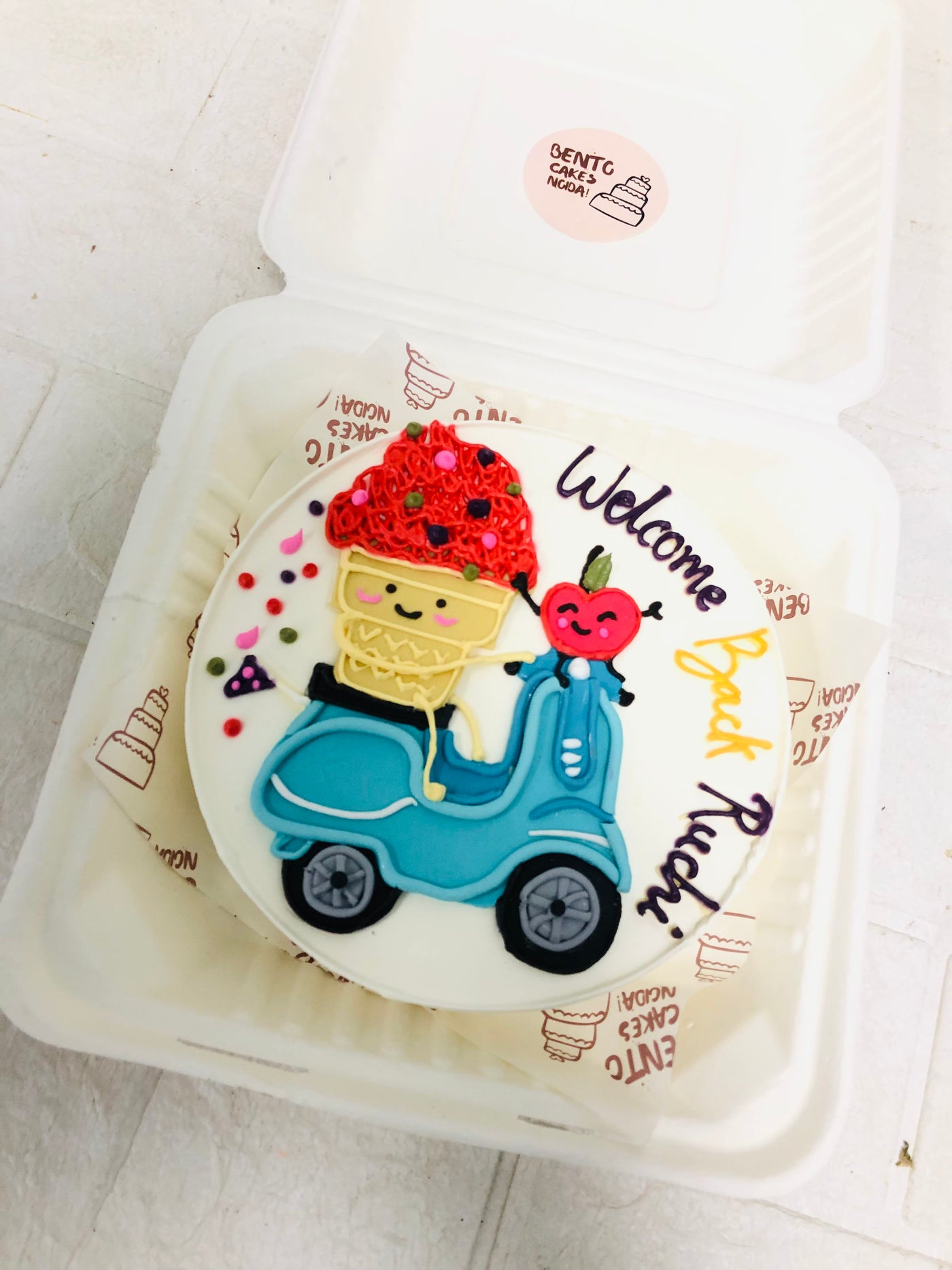 Celebrate a joyful return with this playful bento cake featuring a smiling ice cream cone riding a scooter, accompanied by a heart character and sprinkle-style accents. The message “Welcome Back Rucha” adds a personal touch, making it perfect for warm reunions, surprise gestures, or cheerful homecomings. Compact, colorful, and full of personality.