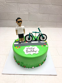 Celebrate with style and speed using this cyclist-themed birthday cake featuring a smooth white top and green base, designed to resemble a road with white dashed lines and colorful floral accents. A fondant figure of a man in sunglasses stands beside a teal bicycle, capturing the spirit of adventure and individuality. A cloud-shaped plaque reads “Happy Birthday” in cursive, making this cake perfect for cycling enthusiasts, outdoor lovers, or personalized gifting with a sporty twist.