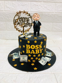Celebrate Anaiza’s birthday with this bold Boss Baby-themed cake featuring a sleek black base scattered with yellow stars and topped with a fondant figure of the iconic Boss Baby in a suit and tie. Surrounding the topper are playful fake dollar bills, reinforcing the theme of business and charm. A golden circular topper reads “Happy Birthday,” while the front of the cake displays “BOSS BABY” in bold yellow letters. Presented on a black board with additional stars and bills, this cake blends animated storytelling with sculpted finesse—perfect for birthday gifting, character uploads, or catalog entries that highlight confidence, humor, and visual flair.
