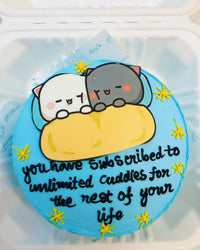 The most notable feature of the cake is the heartfelt message written in black icing. The text reads, "you have subscribed to unlimited cuddles for the rest of your life." This message adds a personal and emotional touch to the cake, making it a perfect gift for a loved one or a special occasion. The playful and affectionate tone of the message complements the cute illustration, creating a cohesive and delightful theme.