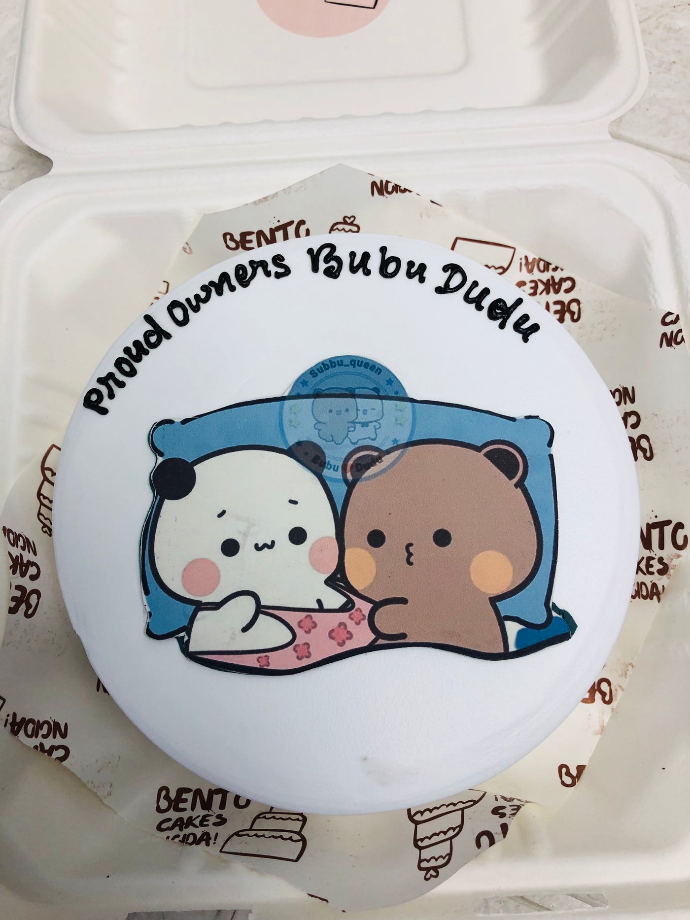 Celebrate love and fandom with this adorable Bubu Dudu-themed cake featuring a printed design of two cartoon characters cuddled under a pink heart-patterned blanket. One character has white fur with black ears and blush cheeks, while the other resembles a brown bear. The message “Proud Owners Bubu Dudu” is printed above the illustration, anchoring the tribute with playful pride. Presented in a white takeout-style box with “BENTO CAKES INDIA!” branding and ice cream cone liner, this cake blends cozy storytelling with soft visuals—perfect for birthday gifting, fandom uploads, or catalog entries that highlight affection, identity, and emotional resonance.