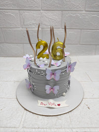 Ek modern aur stylish celebration ke liye, is Elegant Grey & Butterfly Birthday Cake ko chunein. Iska trendy grey frosting, nazuk lavender butterflies aur chamakte motiyon ka design ise ek sophisticated look deta hai. Sone ka '26' candle aur 'Dear Vijita' jaisa personalized message ise kisi bhi milestone birthday ke liye perfect banata hai.