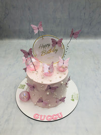 Indulge in our delightful Light Pink Cake adorned with beautiful Butterflies and Balloons. Made with love and crafted to perfection, this cake is the perfect addition to any celebration. The light pink color adds a touch of elegance while the delicate decorations bring joy and wonder. Let this cake be the centerpiece of your next special occasion.
