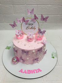 Celebrate Aadhya’s special day with this pastel pink birthday cake featuring elegant butterfly toppers in pink and lavender, some suspended on wires for a floating effect. The top is adorned with translucent pink and iridescent spheres, scattered white edible pearls, and butterfly motifs. A circular topper reads “Happy Birthday” in graceful script, while the name “AADHYA” is spelled out in bold pink letters at the base. Presented on a white board with custom branding, this cake blends whimsical beauty with personalized warmth—perfect for romantic gifting, mood-forward drops, or uploads that highlight soft glamour and emotional charm.