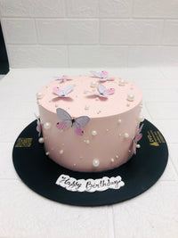 Celebrate with soft elegance using this pastel pink birthday cake featuring smooth frosting and delicate butterfly toppers in shades of pink and lavender. White edible pearls are scattered across the surface and sides, adding texture and charm. A gold “Happy Birthday” message in cursive script completes the look, while the cake rests on a sleek black board for contrast. Perfect for romantic gifting, mood-forward drops, or uploads that blend whimsical beauty with emotional warmth.