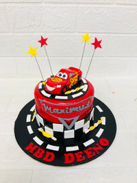 Celebrate with speed using this two-tiered birthday cake inspired by the animated movie Cars. The top tier features a sculpted Lightning McQueen topper with the name “Maximus” in red and white icing. The cake is decorated with racing motifs including a black-and-white checkered pattern, yellow lightning bolts, and red-and-yellow star toppers on wires. The base tier reads “HBD DEENO” in bold red fondant on black. Perfect for Pixar fans, kid birthdays, or gifting drops with high-energy, character-driven charm.