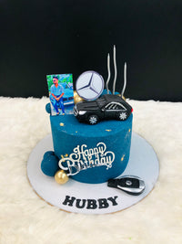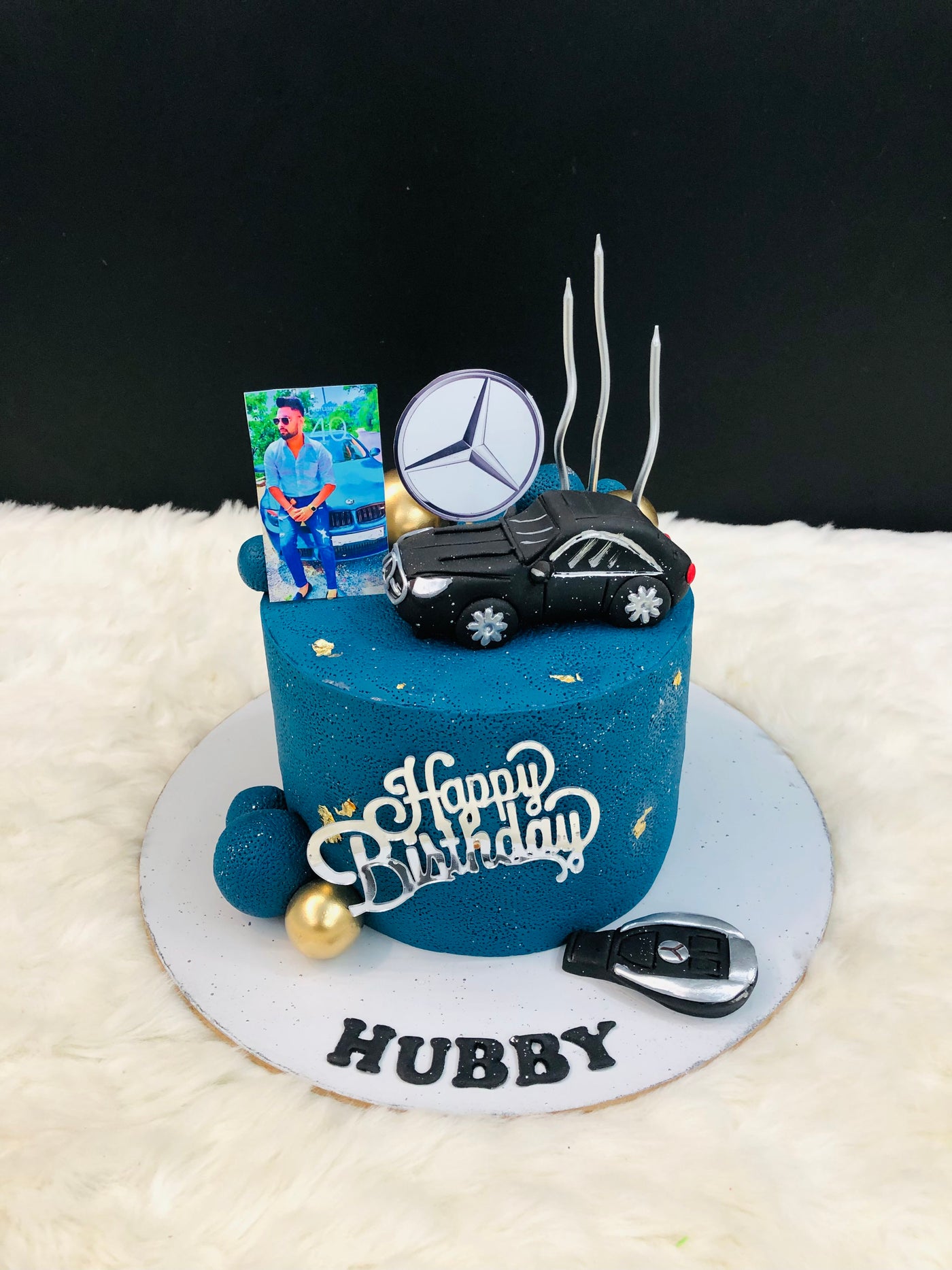 Celebrate in style with this luxury-themed birthday cake featuring a textured blue surface, a miniature black Mercedes-Benz car, and three vertical silver candles. A printed photo of the celebrant adds a personal touch, while the bold “Happy Birthday” message and “HUBBY” lettering on the cake board make it ideal for husbands and partners. Gold and blue spherical accents and a realistic car key model complete the upscale design. Perfect for car enthusiasts, luxury lovers, or personalized gifting.