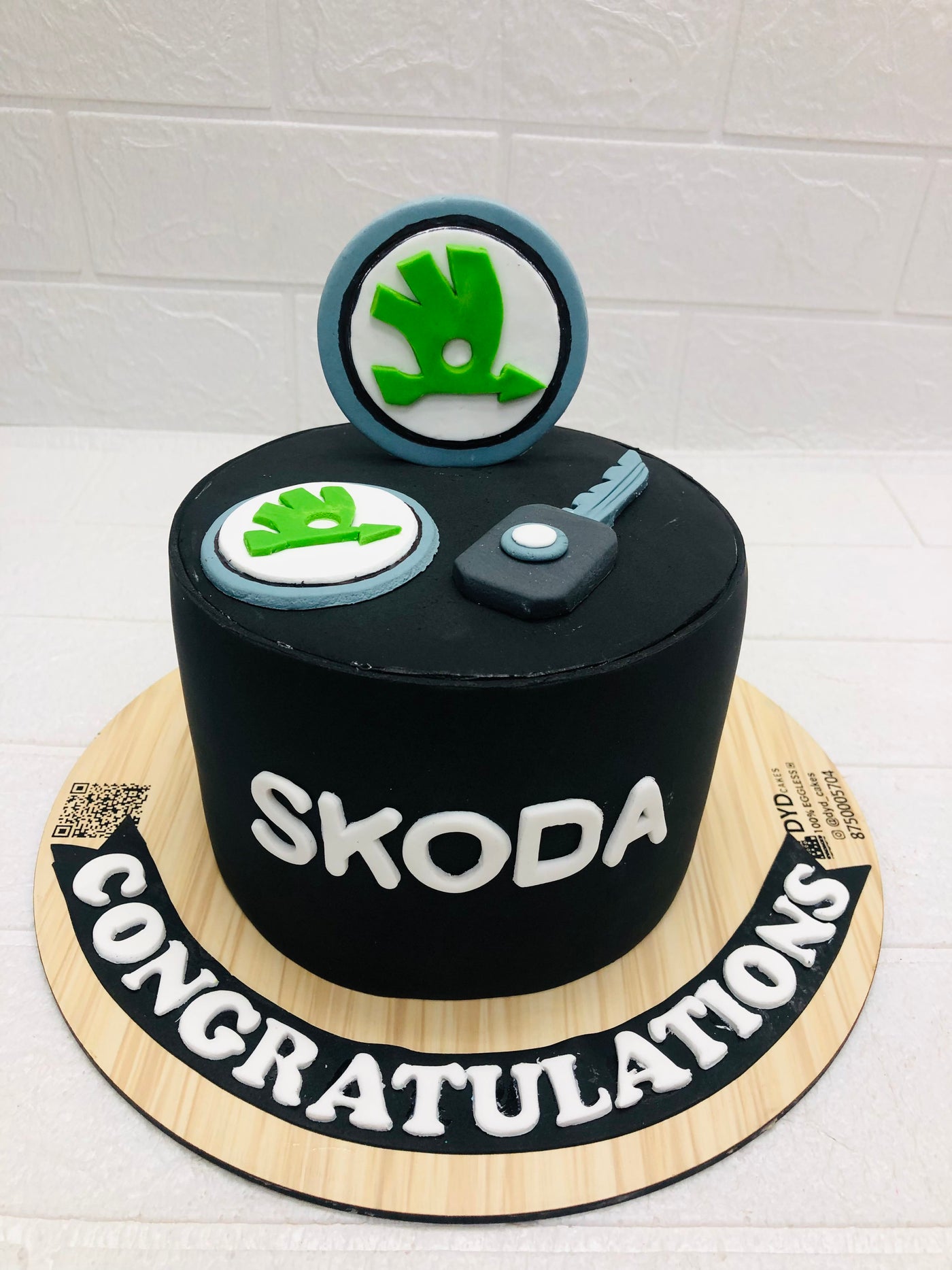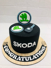 Celebrate a major milestone with this Skoda-inspired cake featuring a sleek black fondant base and sculpted automotive details. The top showcases a fondant car key and two circular emblems with the green Skoda logo, while the side boldly displays “SKODA” in white lettering. The wooden base is ringed with the word “CONGRATULATIONS” in large white letters, making this cake perfect for new car gifting, brand drops, or achievement uploads with luxury styling and personalized flair.