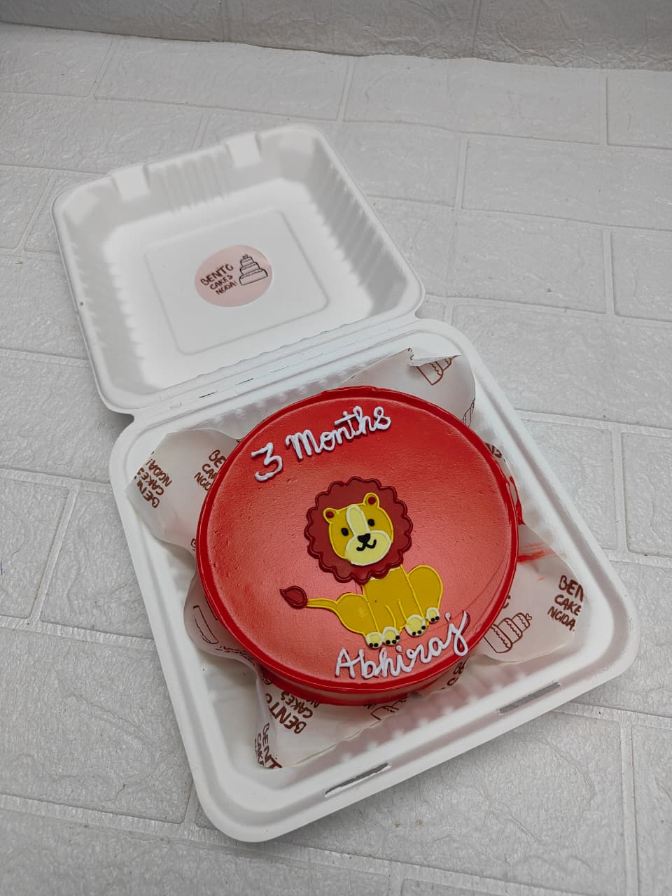 Celebrate baby Abhiraj’s 3-month milestone with this red frosted bento cake featuring a cute cartoon lion illustration. The design includes “3 Months” and “Abhiraj” piped in white icing, making it perfect for monthly baby photos, naming ceremonies, or milestone celebrations. Packaged in a biodegradable takeout box with “SETH CAKE N24” branding.