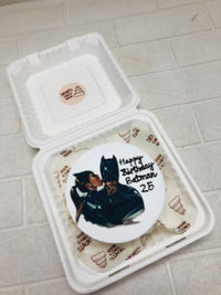 Celebrate with comic-book charm using this Batman-themed bento cake featuring a white frosting base and a romantic illustration of Catwoman kissing Batman on the cheek. The message “Happy Birthday Batman 25” is written in bold icing, making this cake perfect for superhero fans, romantic gifting, or mood-forward drops with playful intimacy and fandom flair. Presented in a white takeout-style box with branded lining.