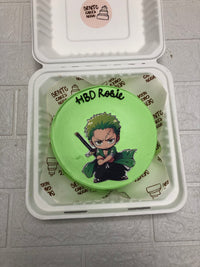 Celebrate Rosie’s birthday with this anime-themed bento cake featuring a smooth light green frosting base and an edible image of Roronoa Zoro from One Piece, depicted in his sig...