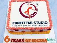 The cake is rectangular, boasting a pristine white base that serves as the perfect canvas for the celebration message. At the center, the FunFitFab Studio logo stands out with its distinctive maroon ring and dynamic dancer silhouette, reinforcing the brand’s commitment to fitness, fun, and well-being. The studio’s inspiring tagline, “Have Fun, Get Fit, Feel Fabulous!” is prominently displayed in dark blue, adding an energetic and motivational touch.