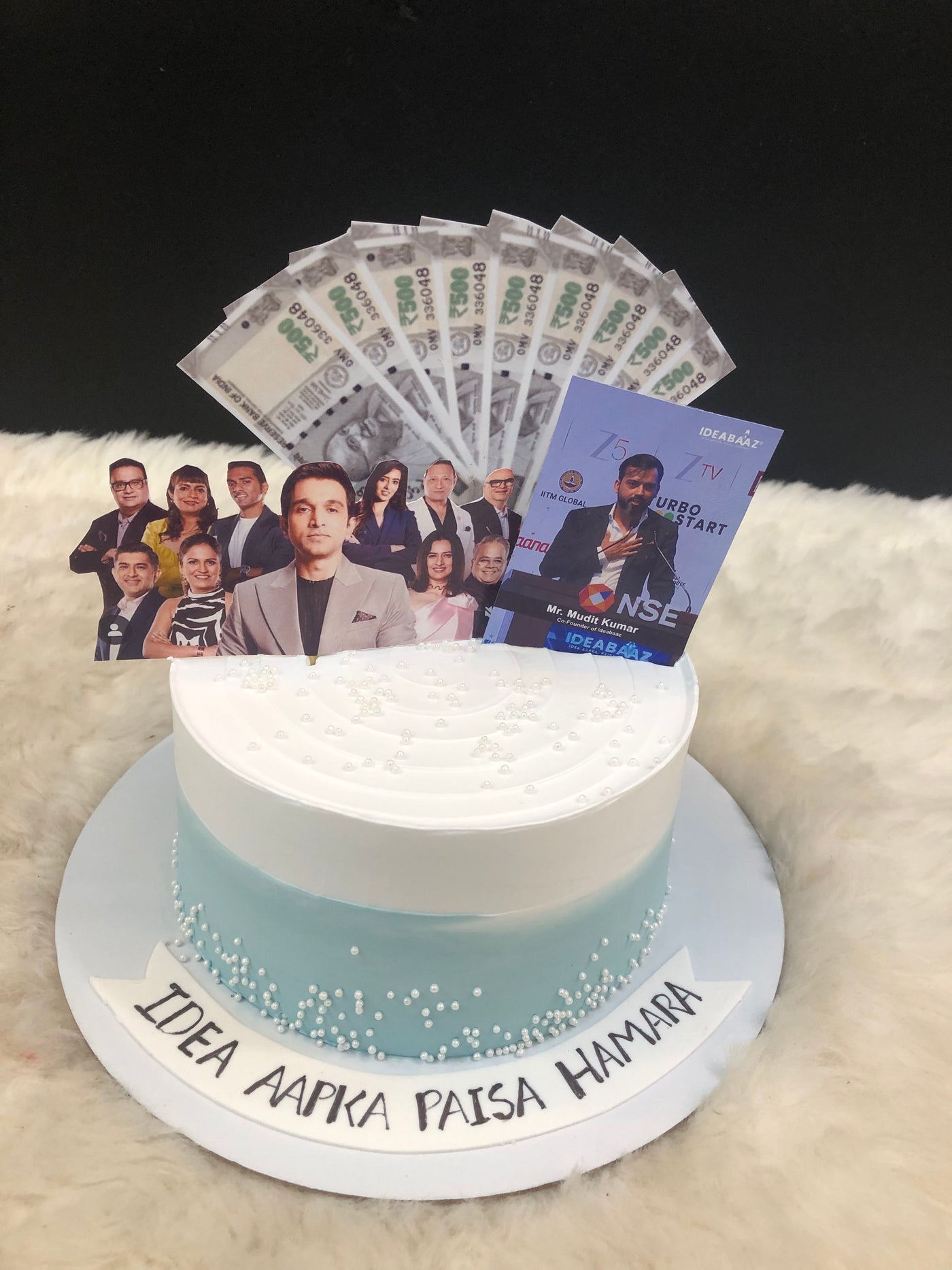 A bold tribute to innovation and investment, this gradient blue-and-white cake features edible pearls, currency fan toppers, and cut-outs of entrepreneurial icons. The message “Idea Aapka, Paisa Hamara” captures the spirit of venture backing, making it perfect for pitch events, incubator milestones, or founder birthdays. A delicious way to honor big ideas and bigger dreams.