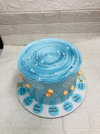 Celebrate togetherness with this beautifully decorated group cake featuring a light blue frosting base and a spiral top design adorned with white pearl-like beads. The sides showcase yellow floral accents and white dandelion-style patterns with green stems, adding botanical charm and visual softness. Around the white circular board, names are piped in blue and black icing: Alok Mohanty, Bipin Kumar, Kaustav Chatterjee, Ash Dwivedi, Tapan Roul, Yogesh Kumar, and Sidharth Mishra—anchoring the tribute with personalization and pride. This cake blends floral elegance with heartfelt storytelling—perfect for team gifting, farewell uploads, or catalog entries that highlight unity, gratitude, and emotional resonance.