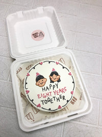Celebrate eight years of togetherness with this charming bento-style cake featuring a smooth white frosting base and hand-drawn illustrations of a smiling couple in party hats. Pink hearts and black accents frame the design, while the message “HAPPY EIGHT YEARS TOGETHER” is written in playful icing. Perfect for anniversaries, relationship milestones, or sentimental gifting that blends humor, love, and minimalist style.
