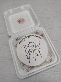 Celebrate your love story with this minimalist and heartwarming bento cake. Featuring a hand-drawn sketch-style couple cuddling and surrounded by tiny red hearts, this cake is perfect for anniversaries, special moments, or just because. Customized with your own sweet message, it’s a heartfelt treat in a charming size.