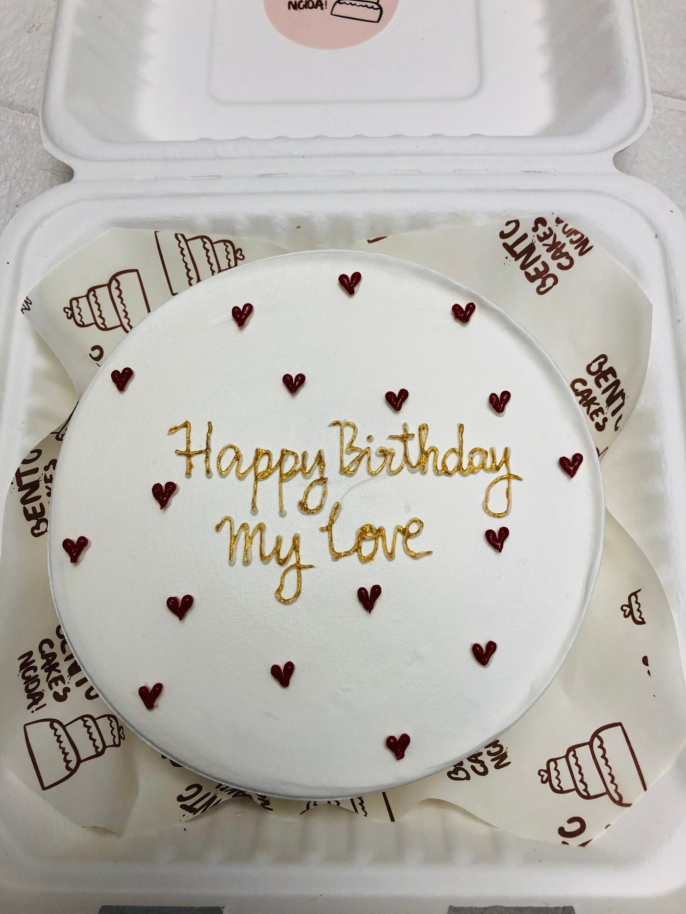 Celebrate your partner with this elegant white bento-style cake featuring the heartfelt message “Happy Birthday My Love” in gold icing. Decorated with evenly spaced red hearts, this compact cake is perfect for romantic gifting, anniversaries, or birthday surprises that speak softly but deeply. Packaged in a takeout-style box with branded lining for a polished finish.