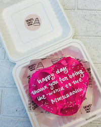 This personalised bento cake in pink shades is shaped in a heart and is perfect for any special occasion. Customize it with your desired message and surprise your loved ones with a unique and delicious treat. Made with high-quality ingredients, it's a sweet and thoughtful gesture that will surely be appreciated.