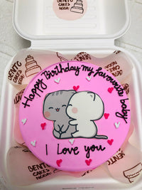 Celebrate your favourite boy with this tender bento cake featuring a soft pink frosting base and a cartoon-style illustration of two hugging cats—one gray, one white—surrounded ...