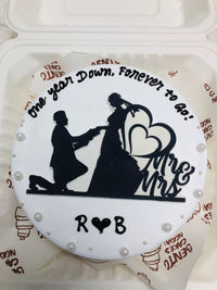 Celebrate one year of love with this romantic bento-style anniversary cake featuring a white base and a silhouette illustration of a man kneeling to propose to a woman in a gown. The design includes overlapping heart shapes and the message “Mr & Mrs” in stylized script. Around the top edge, the cake reads “one year down, forever to go!” in black icing, while the initials “R ♥ B” anchor the tribute at the bottom. Pearl-like embellishments circle the edge, adding elegance. Presented inside a white takeout-style box with branded parchment liner, this cake blends emotional storytelling with sculpted finesse—perfect for anniversary gifting, couple uploads, or catalog entries that highlight romance, memory, and visual intimacy.