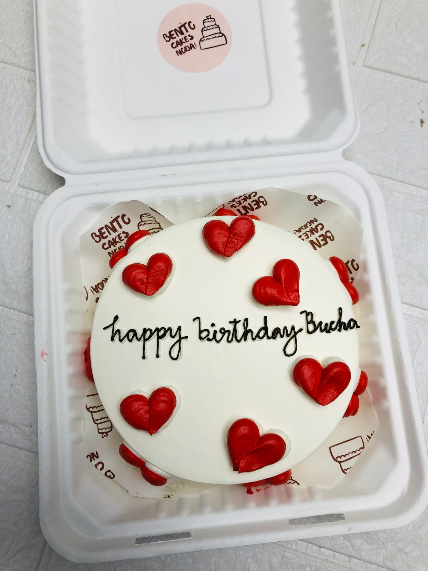 Celebrate Bucha’s birthday with this sweet and simple bento cake featuring a smooth white frosting base and evenly spaced red heart decorations across the top. The message “Happ...