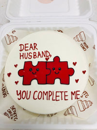 Celebrate your bond with this romantic bento-style cake featuring two smiling red puzzle pieces that fit together perfectly, surrounded by tiny red hearts. The message “DEAR HUSBAND, YOU COMPLETE ME” is written in red icing, making this cake ideal for birthdays, anniversaries, or heartfelt gifting to your life partner. Compact, sweet, and full of meaning.