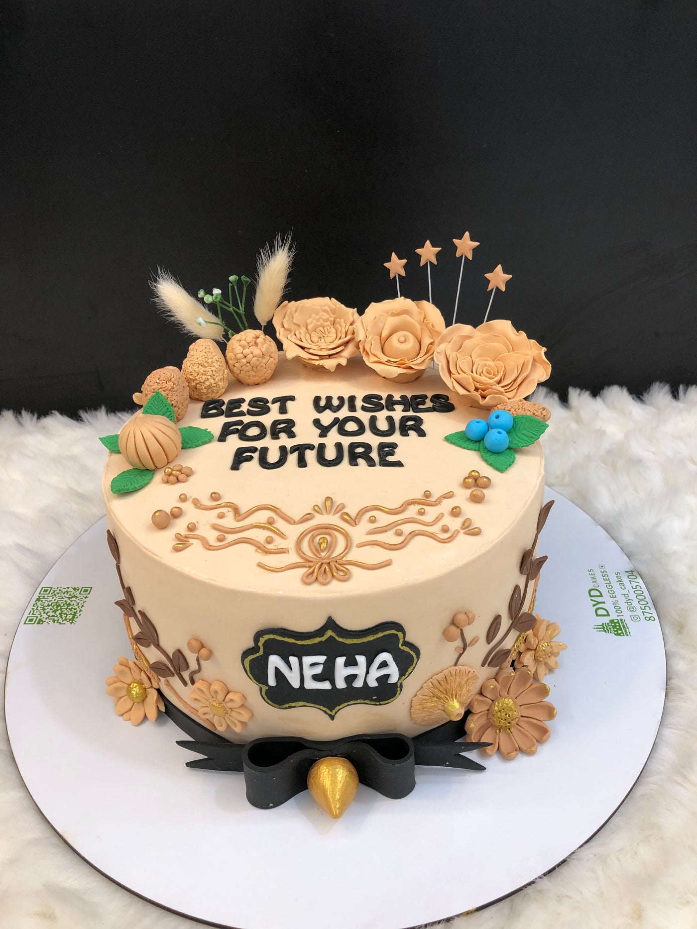 Send off Neha with grace using this elegant farewell cake featuring a smooth white base adorned with beige fondant roses, blue berries, green leaves, and ornamental accents like gold-tipped stars and textured spheres. The message “BEST WISHES FOR YOUR FUTURE” is piped in black icing, anchored by a black plaque with “NEHA” written in white. A sculpted black bow with a golden heart sits at the base, adding a touch of sophistication. Presented on a white circular board against a black backdrop, this cake blends floral finesse with emotional depth—perfect for farewell gifting, milestone uploads, or catalog entries that highlight celebration, transition, and heartfelt connection.