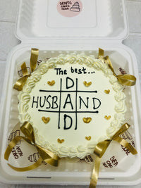 Celebrate your partner with this clever anniversary bento cake featuring a smooth white frosting base and a tic-tac-toe-style message layout. The grid spells out “THE BEST DAD AND HUSBAND” using black icing, framed by golden ribbon bows and tiny heart decorations. Presented in a white takeout-style container with branded liner, this cake blends playful logic with emotional depth—perfect for romantic gifting, tribute drops, or uploads that highlight love, appreciation, and creative storytelling.