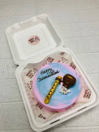 Celebrate Janmashtami with this pastel pink and blue gradient cake featuring fondant decorations of a yellow flute and a brown hammer with white foam—symbolic elements tied to Lord Krishna’s birth. The top reads “Happy Janmashtami” in black icing, making it a perfect centerpiece for festive gatherings, temple offerings, or personalized celebrations of Krishna’s birth.